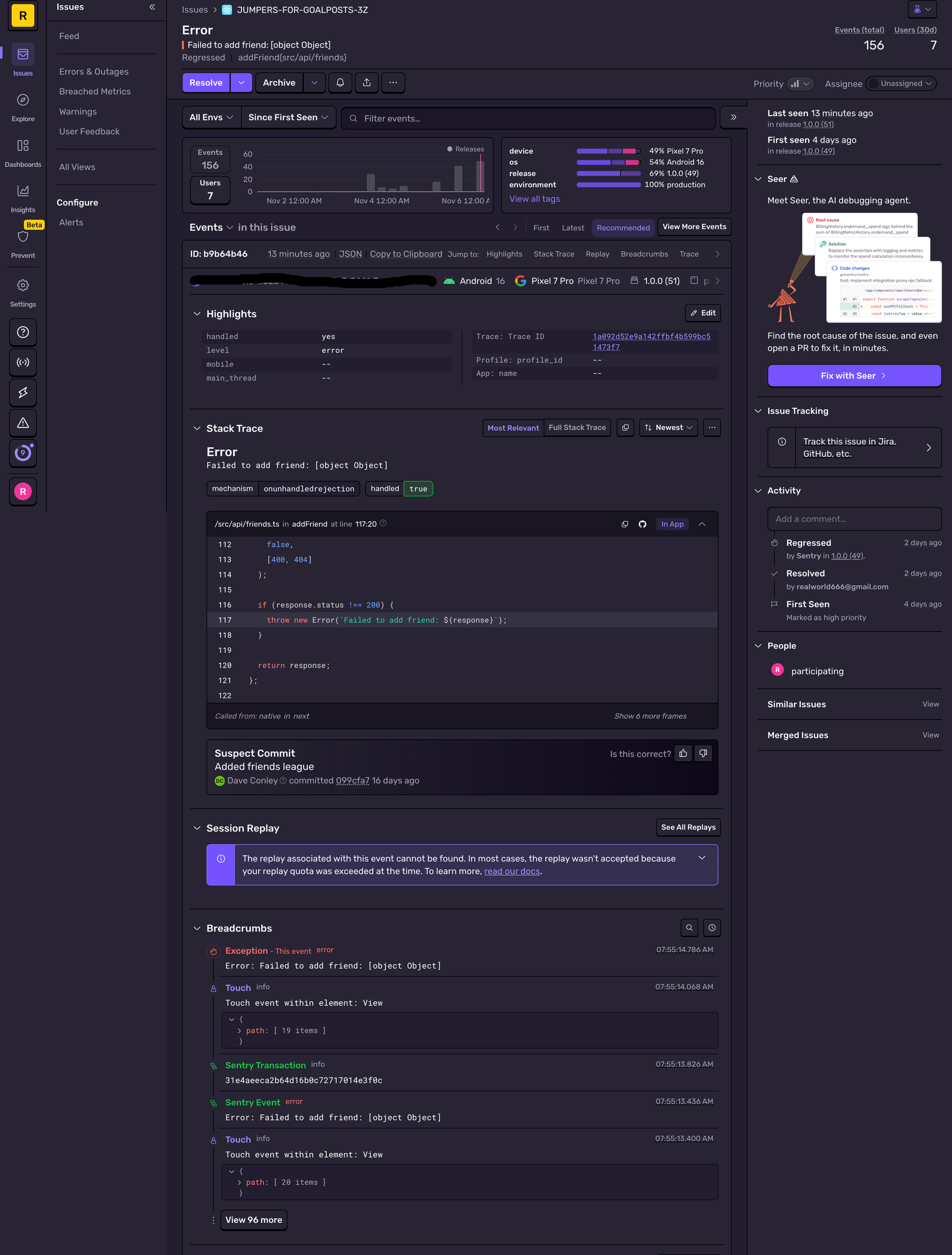 I restricted my alarms to just the lambdas that were running from triggers, like the lambda that runs match logic twice a day. For the API endpoints, I used Sentry. This is a 3rd party specialist monitoring service that has its own generous free tier. I've added this to both the mobile app and the backend to catch errors, and it will provide some really in-depth logs of the error and emails me whenever there is a new issue.